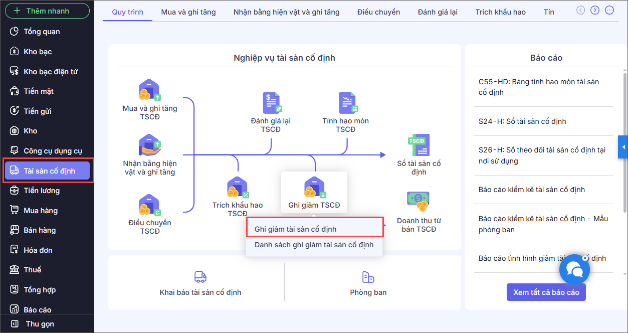 Bước 1: Vào Tài sản cố định\Quy trình\Ghi giảm TSCĐ, nhấn Ghi giảm tài sản cố định.