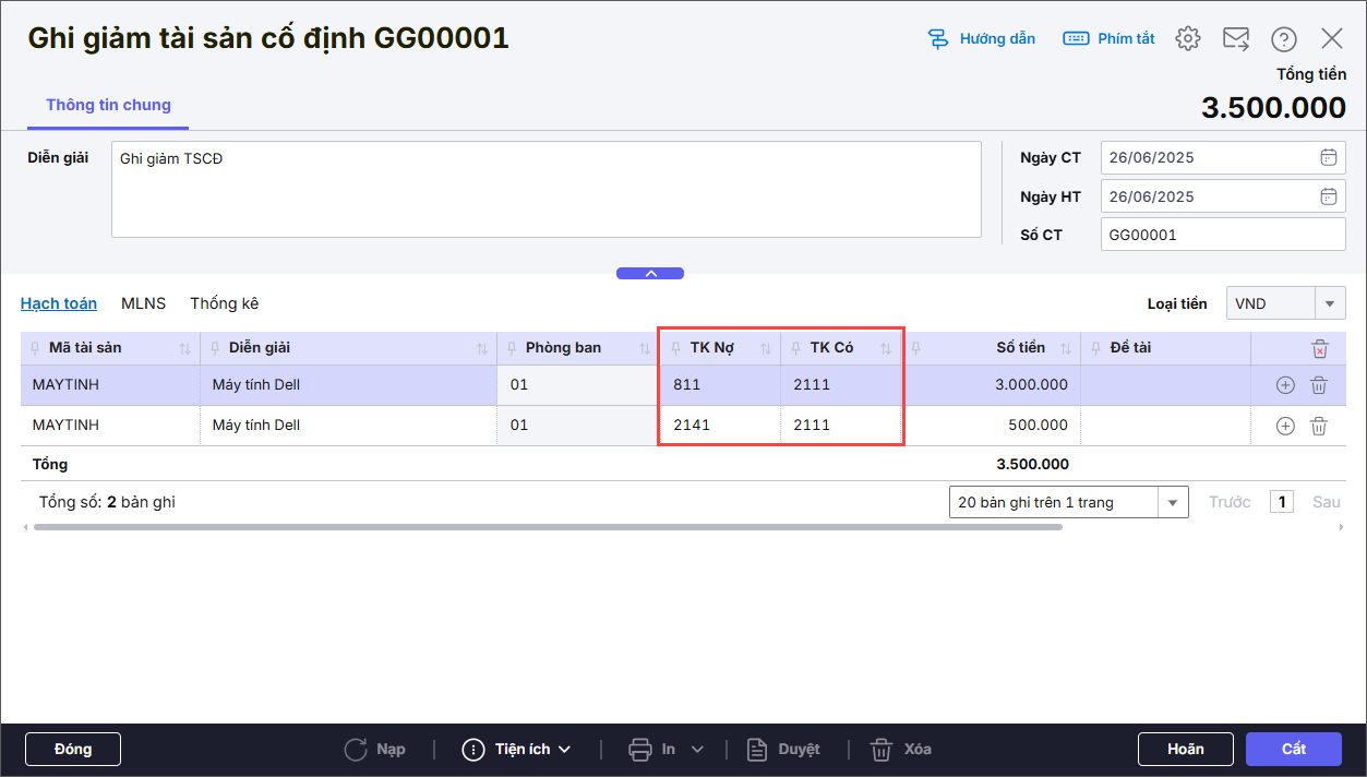 • Nhập thông tin chi tiết tại tab Hạch toán: chọn Mã tài sản cần ghi giảm. Nhập TK Nợ, TK Có, Số tiền.