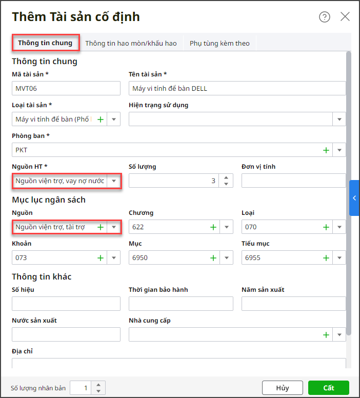 Lưu ý: Nếu muốn thêm nhiều tài sản giống nhau, nhập số lượng tại ô Số lượng nhân bản.