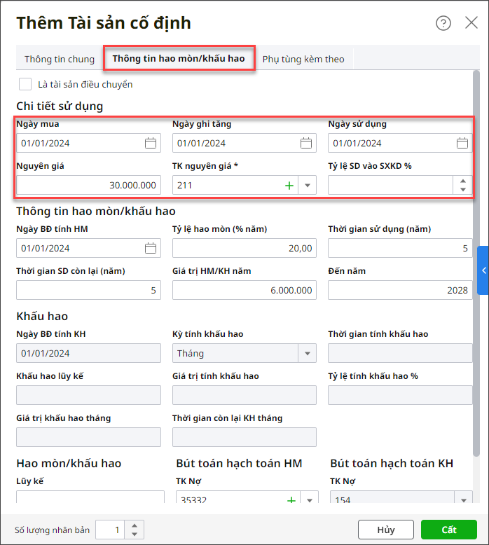 3. Khai báo thông tin tại mục Thông tin hao mòn/khấu hao.