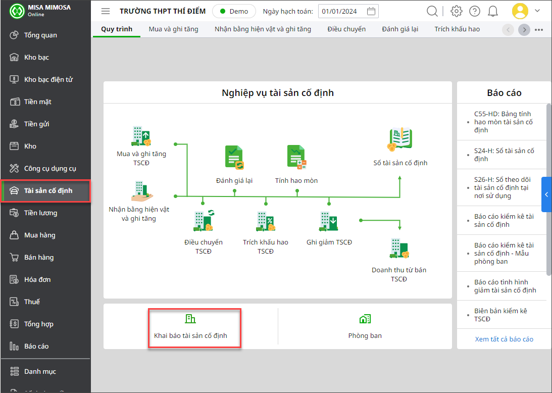 9. Xem/In báo cáo liên quan: S31- H Sổ tài sản cố định; S32-H Sổ theo dõi tài sản cố định tại nơi sử dụng bằng cách chọn chức năng Báo cáo.