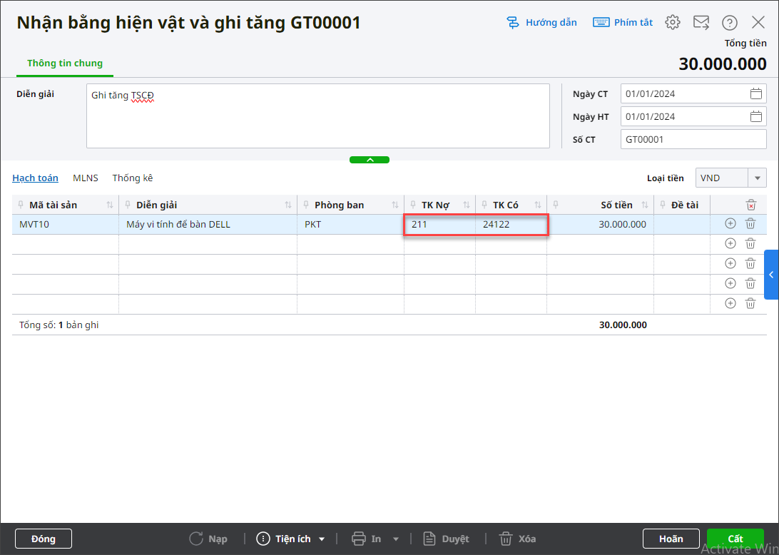 6. Nhấn để sinh chứng từ Nhận bằng hiện vật và ghi tăng Tài sản cố định.