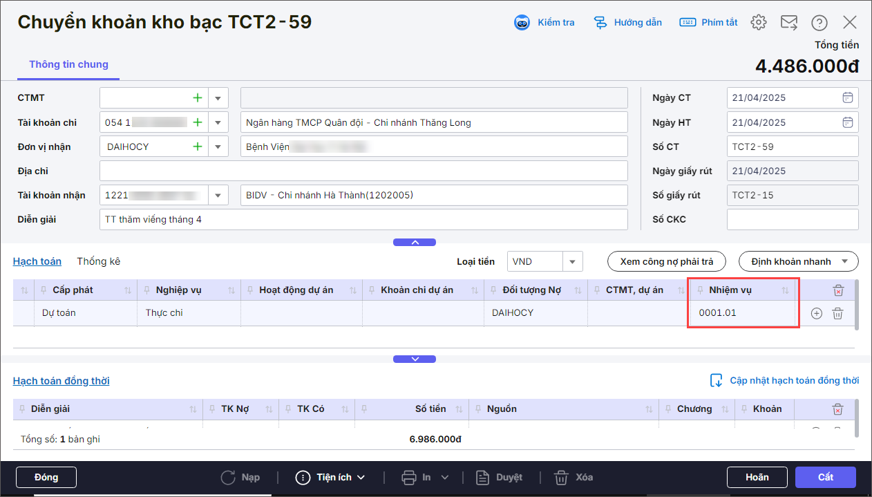 Lưu ý: Khi lập các chứng từ phát sinh, anh/chị cần chọn NHIỆM VỤ.