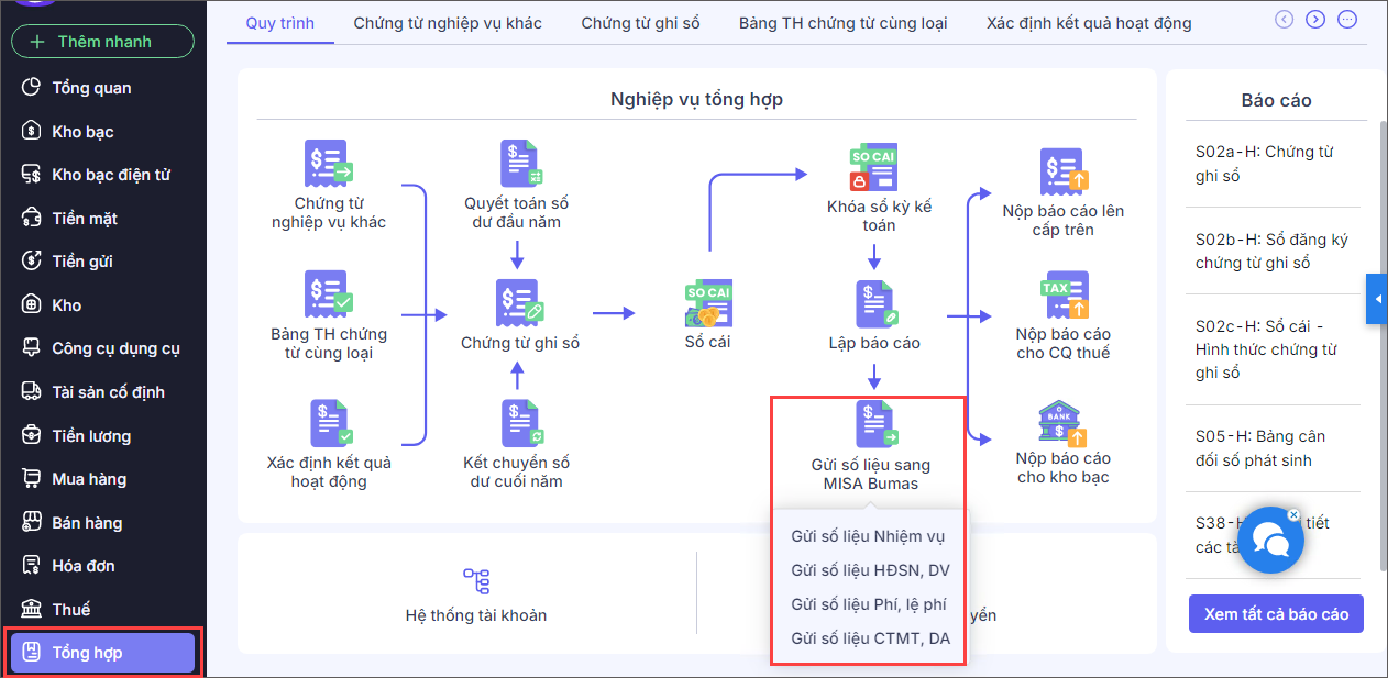 – Vào phân hệ Tổng hợp\Gửi số liệu sang MISA Bumas.