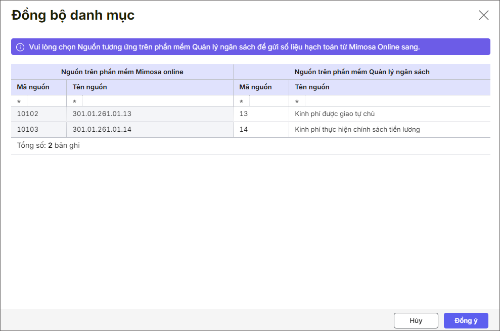 – Nếu danh mục trên Mimosa Online chưa khớp với danh mục trên MISA Bumas thì anh/chị cần thực hiện đồng bộ danh mục trước. Sau đó nhấn Đồng ý.