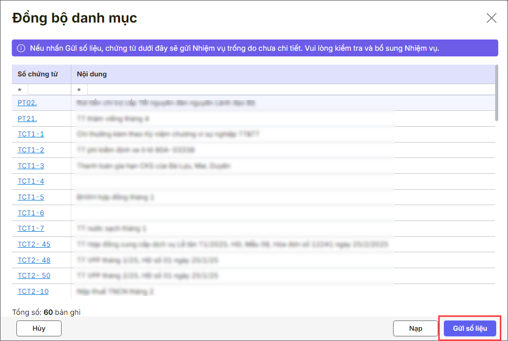 – Sau khi đồng bộ danh mục thành công, hệ thống hiển thị danh sách các chứng từ phát sinh đang không hạch toán chi tiết theo danh mục cần gửi để anh/chị kiểm tra: