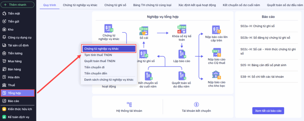 Bước 1: Vào Tổng hợp\Quy trình\Chứng từ nghiệp vụ khác, nhấn Chứng từ nghiệp vụ khác