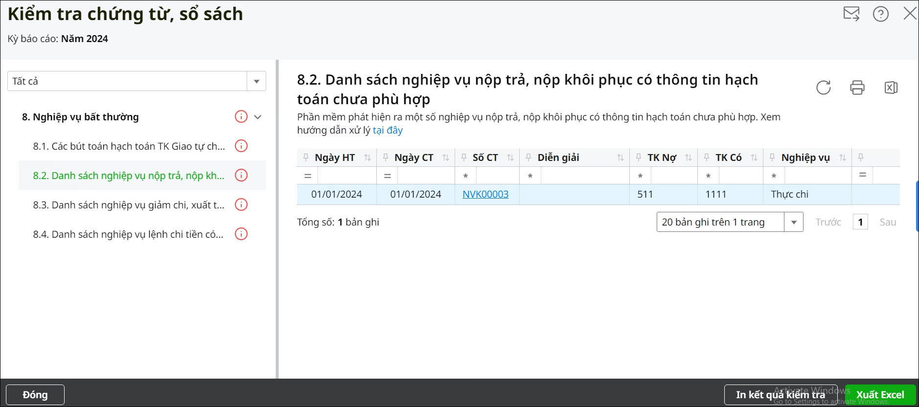 Bước 2: Nhấn vào mục 8.2. Nếu phát hiện các bút toán hạch toán Nợ TK 1351, 1352, 511 nhưng nghiệp vụ không chọn là Nộp khôi phục hay Nộp trả thì chương trình hiển thị cảnh báo đỏ và thể hiện chi tiết chứng từ như sau: