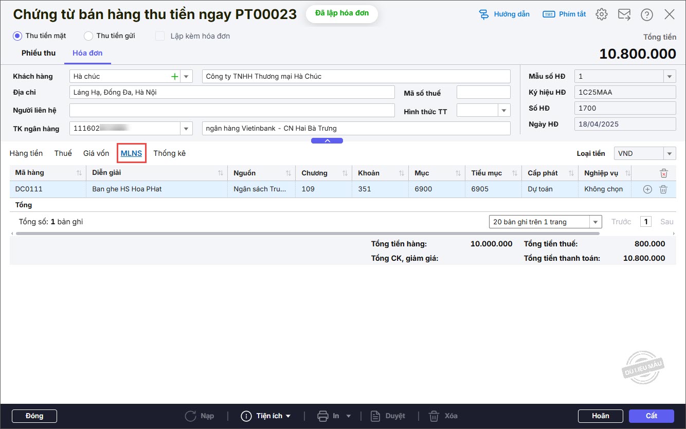 Bước 8: Chọn tab MLNS và khai báo thêm các thông tin MLNS: