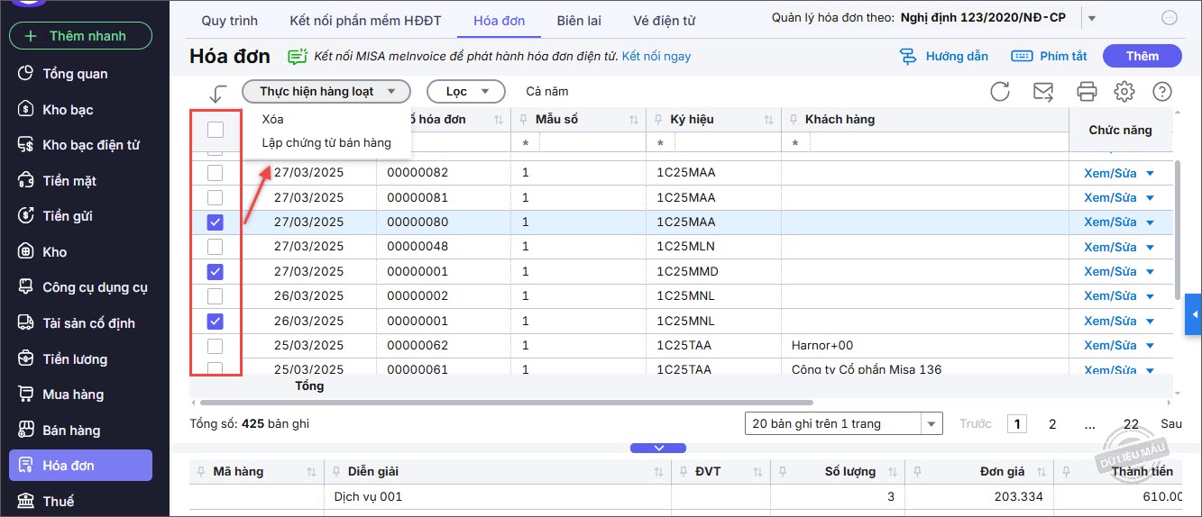 Bước 2: Tại phân hệ Hóa đơn, tab Hóa đơn, tích chọn các hóa đơn cần lập chứng từ bán hàng.