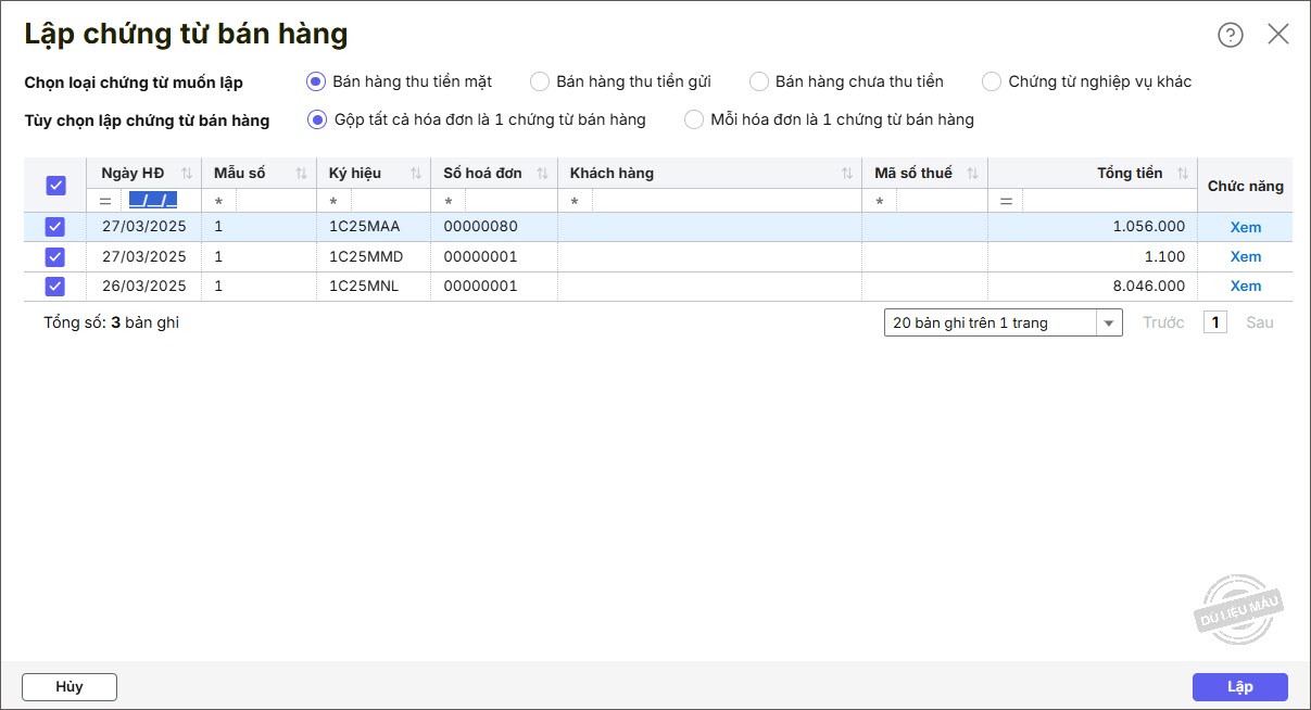 Bước 6: Phần mềm tự động tích chọn loại chứng từ muốn lập dựa trên Hình thức thanh toán trên hóa đơn (có thể chọn lại loại chứng từ cần lập là Bán hàng thu tiền ngay, bán hàng chưa thu tiền, chứng từ nghiệp vụ khác nếu muốn thay đổi ). Nhấn Lập.