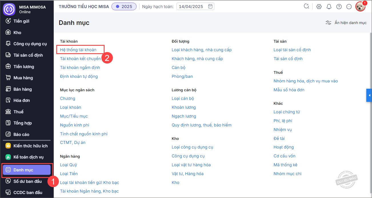 Bước 1: Chọn menu Danh mục\Hệ thống tài khoản.