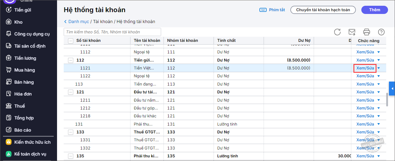 Bước 2: Kích đúp chuột hoặc nhấn Xem/Sửa tại tài khoản cần sửa.