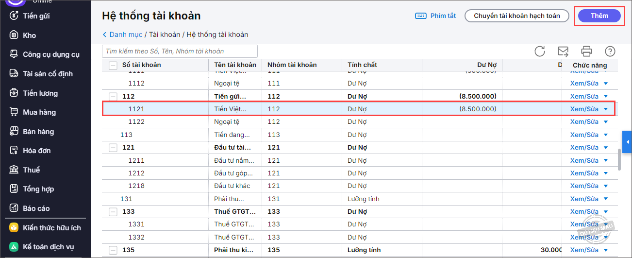 Bước 2: Để thêm mới tài khoản, bạn chọn vào dòng tài khoản tổng hợp cần thêm, nhấn Thêm.