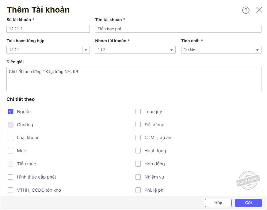 - Chi tiết theo: Xác định có theo dõi tài khoản chi tiết theo Nguồn, Loại khoản, Hình thức cấp phát, Loại quỹ, đối tượng, mã thống kê, CTMT/DA, hoạt động….. hay không. Nếu tài khoản cần theo dõi chi tiết theo tiêu chí nào, tích chọn vào ô vuông trước tiêu chí đó.
