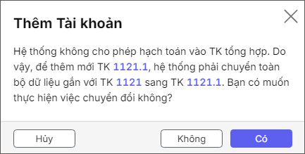 - Nhấn Có nếu muốn thêm TK chi tiết cho TK đã có phát sinh, khi đó phần mềm sẽ chuyển toàn bộ phát sinh từ TK tổng hợp sang TK chi tiết vừa thêm.
