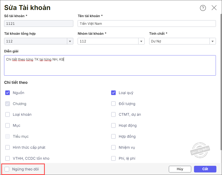 - Nếu theo dõi/ngừng theo dõi TK tổng hợp thì mặc định theo dõi/ngừng theo dõi tất cả các TK con chi tiết của TK tổng hợp đó.