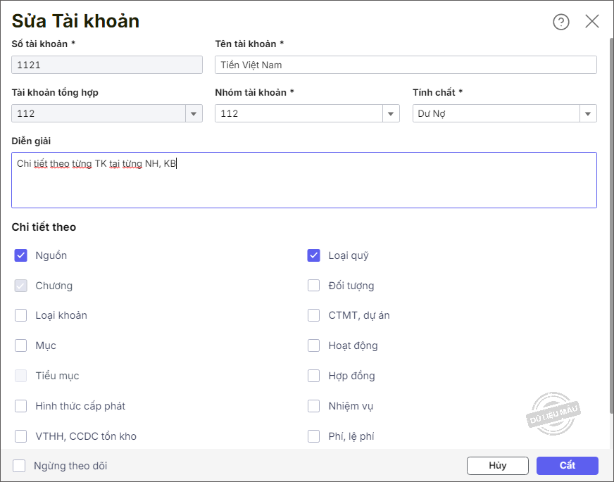- Đối với các tài khoản tổng hợp và tài khoản mặc định mang đi thì không được phép sửa Số tài khoản và Tài khoản tổng hợp.