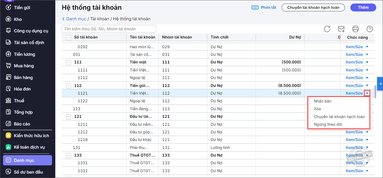 Bài viết hướng dẫn bạn cách thêm, sửa,nhân bản, ngừng theo dõi và quản lý hệ thống tài khoản kế toán.