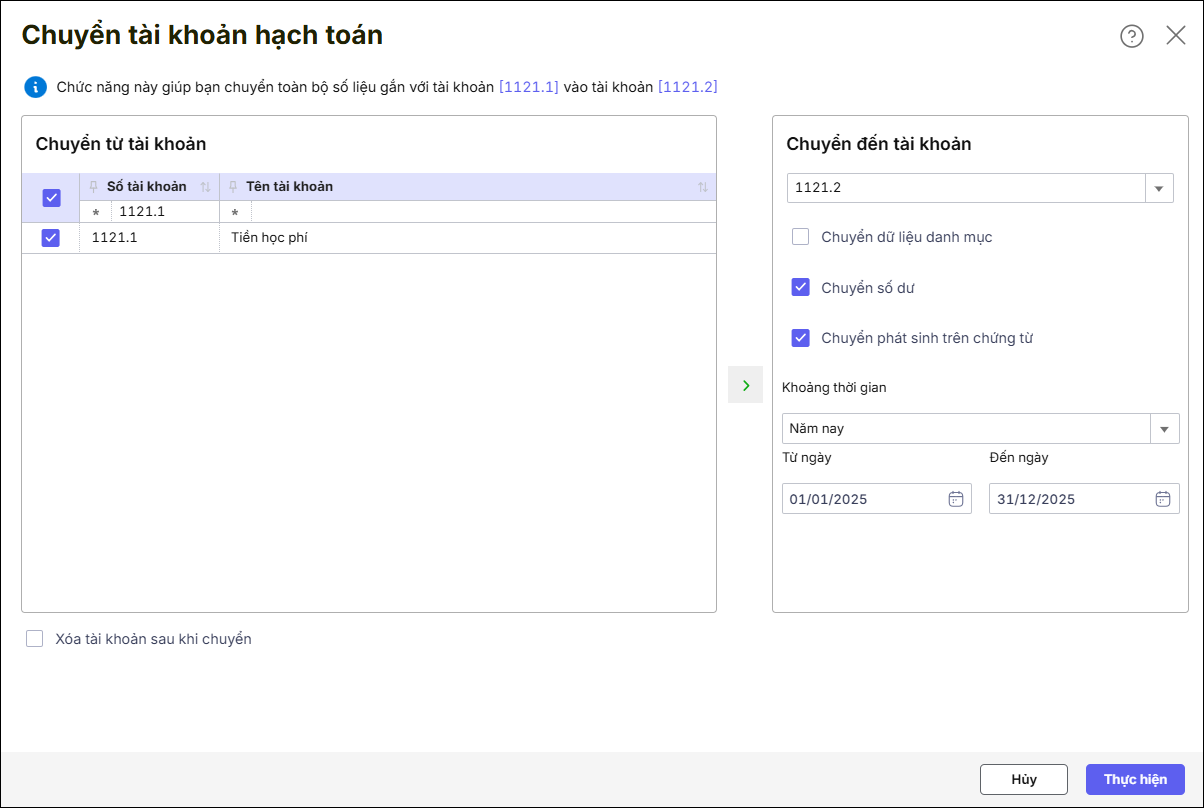 Ngoài ra bạn còn có thể thực hiện nghiệp vụ Chuyển tài khoản hạch toán, cho phép chuyển Danh mục, Số dư và các phát sinh từ tài khoản cũ sang tài khoản mới.
