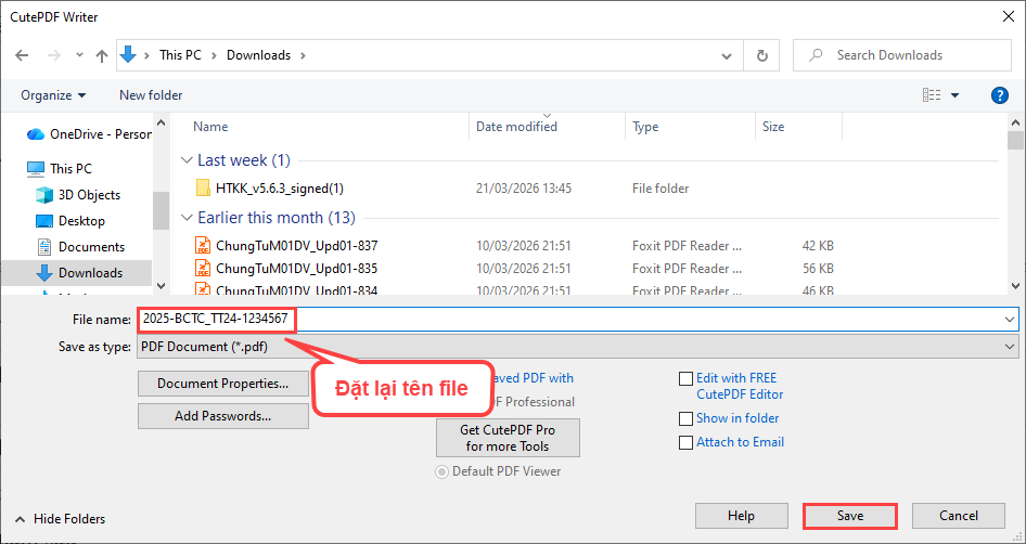 Bước 4: Anh chị chọn thư mục lưu, đặt tên file và tích Save
