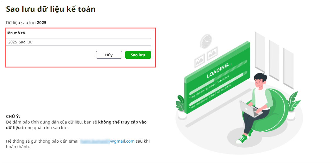 - Nhập Tên mô tả dữ liệu sao lưu. Nhấn Sao lưu.