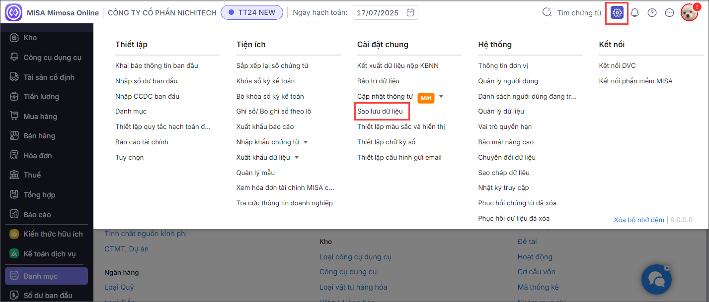 Bước 1: Tại dữ liệu đang làm việc, vào biểu tượng Bánh răng ⚙ (góc phải phía trên)\Thiết lập\Sao lưu dữ liệu.