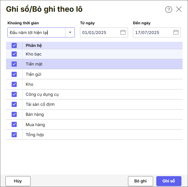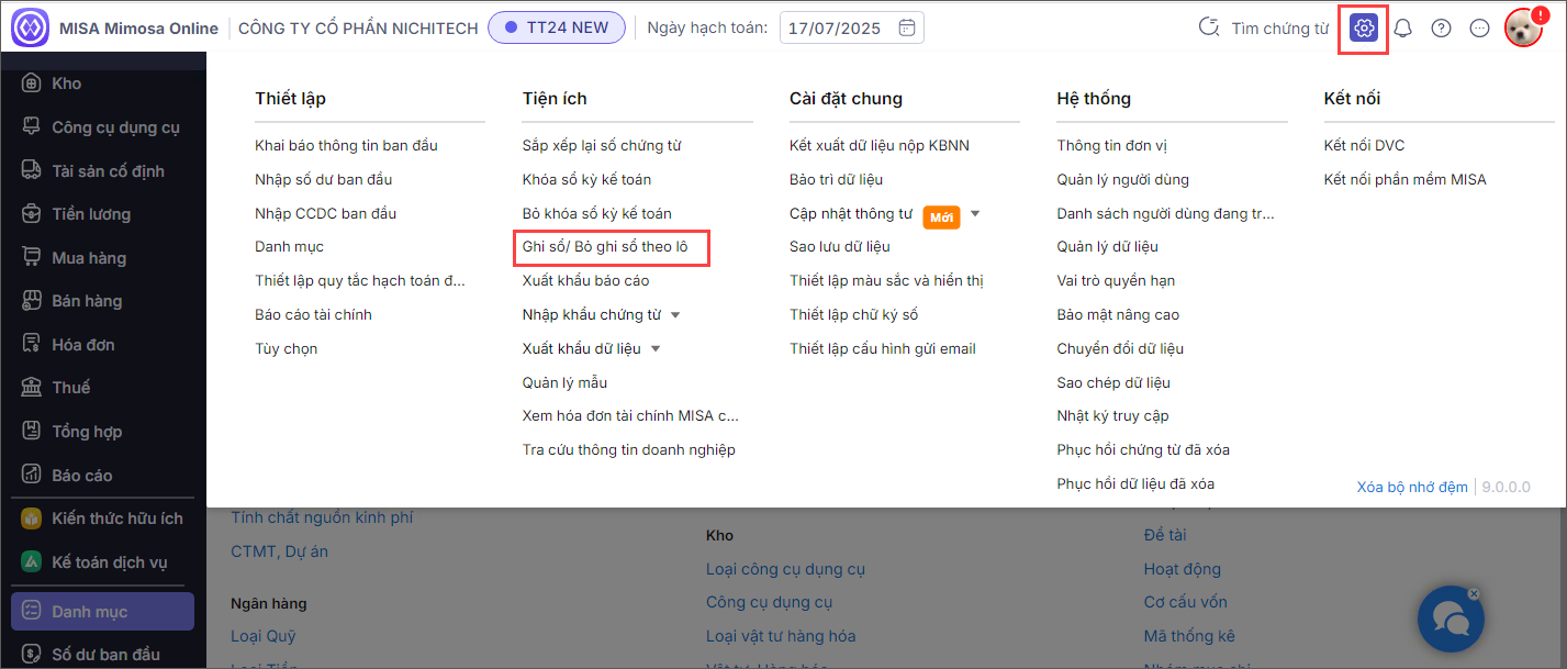 - Vào biểu tượng Bánh răng ⚙ (góc phải phía trên)Thiết lập, chọn Ghi sổ/bỏ ghi sổ theo lô.
