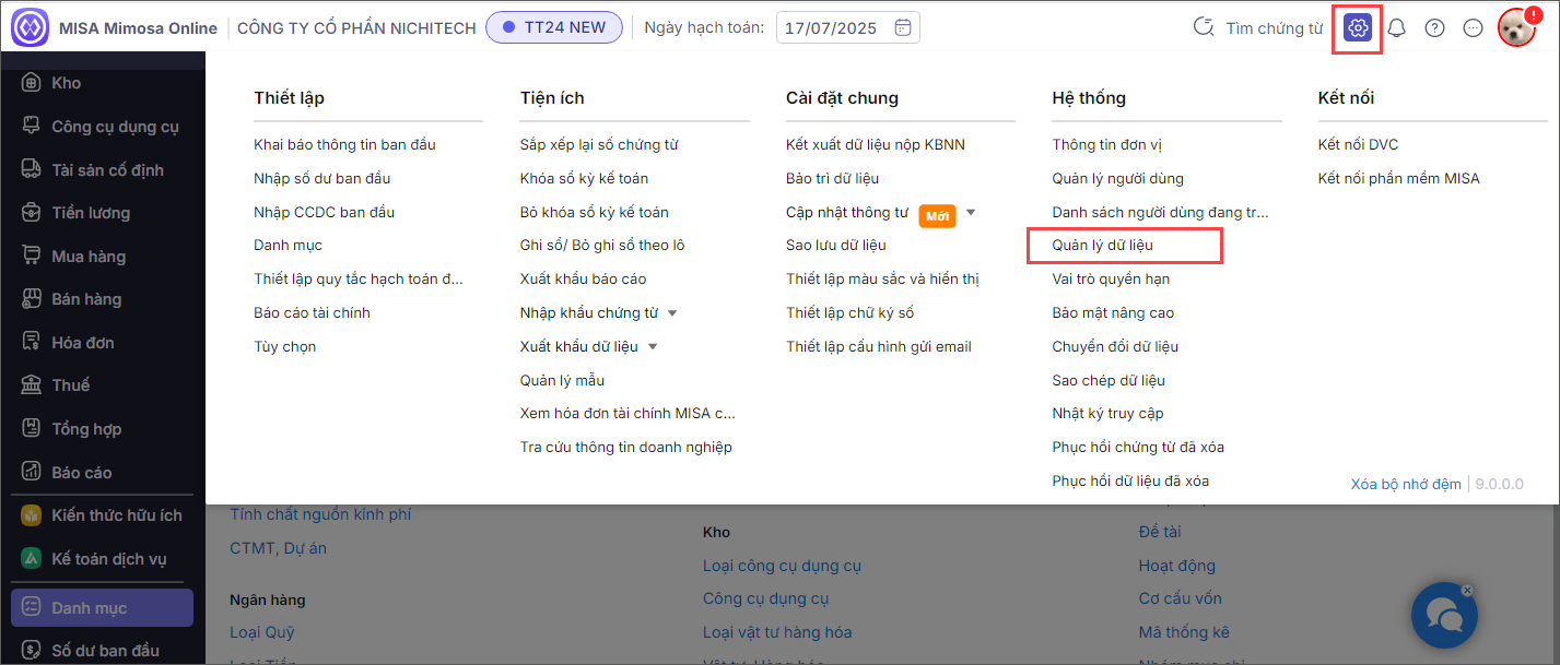 Bước 2: Sau đó vào biểu tượng Bánh răng ⚙ (góc phải phía trên)Thiết lập\Quản lý dữ liệu.