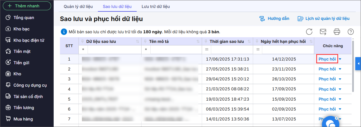 - Nhấn Phục hồi tại dữ liệu vừa sao lưu.