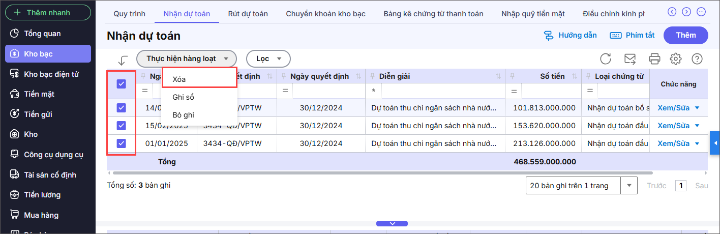 - Sau đó vào từng phân hệ và thực hiện xóa các chứng từ.