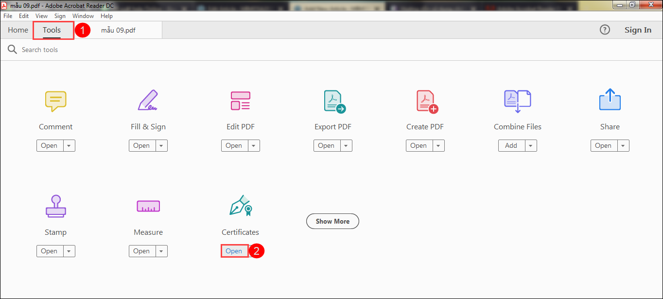 1. Nhấn chọn Tool sau đó nhấn Open tại mục Certificates.