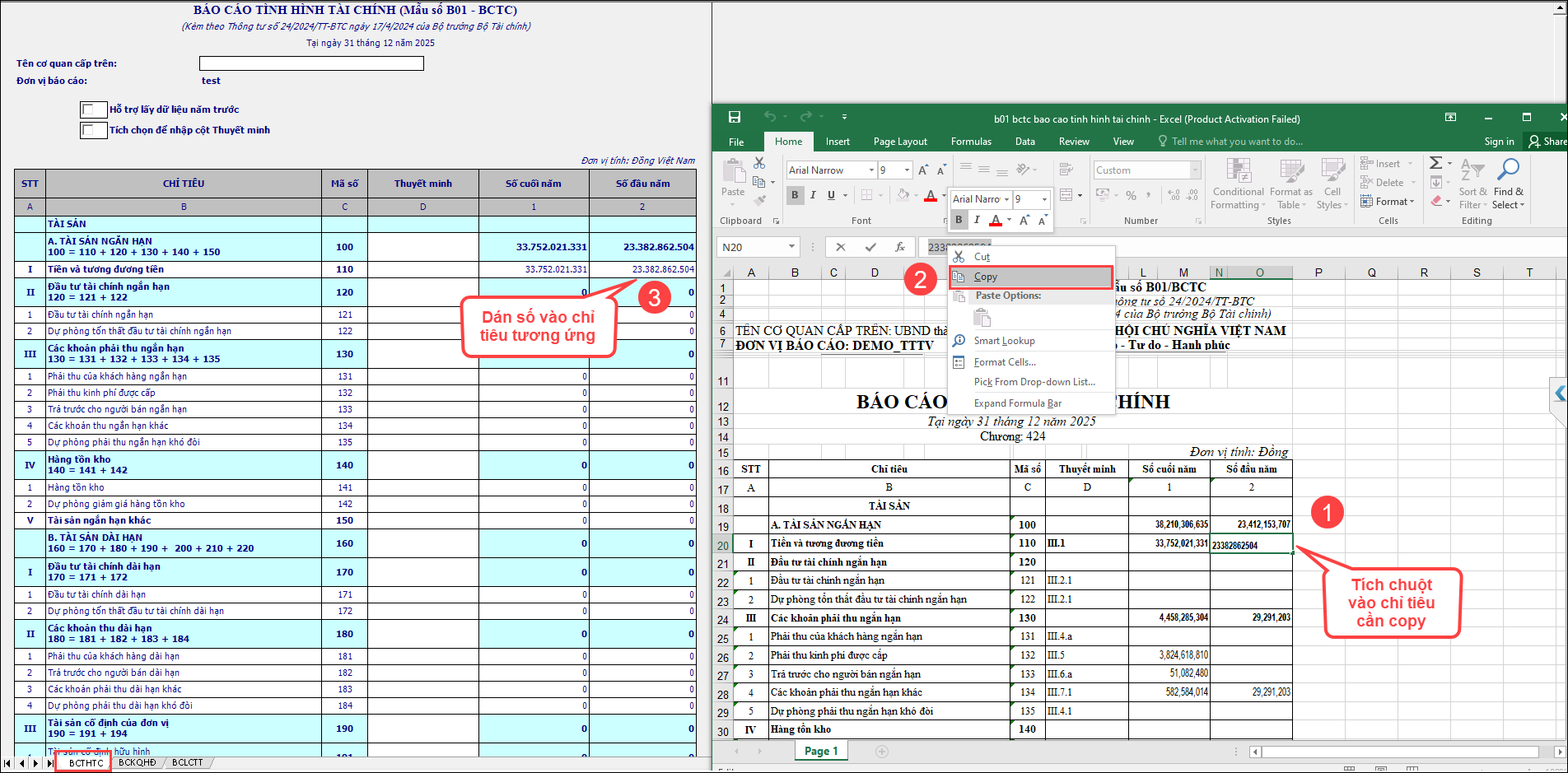 Bước 5: Mở báo cáo đã xuất khẩu excel từ rồi thực hiện copy và dán lần lượt vào các chỉ tiêu trên HTKK