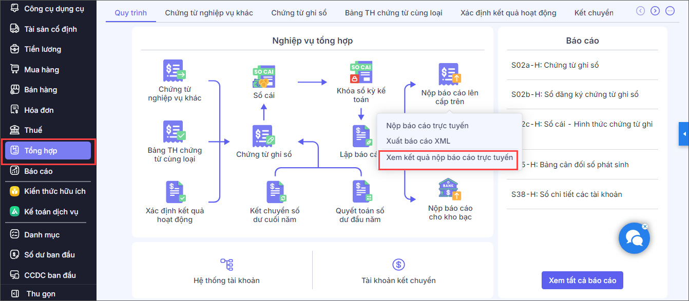 Bước 1: Vào phân hệ Tổng hợp, chọn Nộp báo cáo lên cấp trên\Xem kết quả nộp báo cáo trực tuyến.