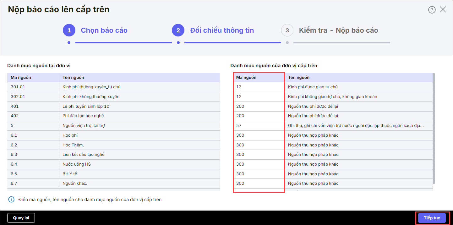 - Thực hiện ghép nguồn của đơn vị cấp trên với nguồn tại đơn vị cho khớp bằng cách chọn Mã nguồn, Tên nguồn tương ứng.