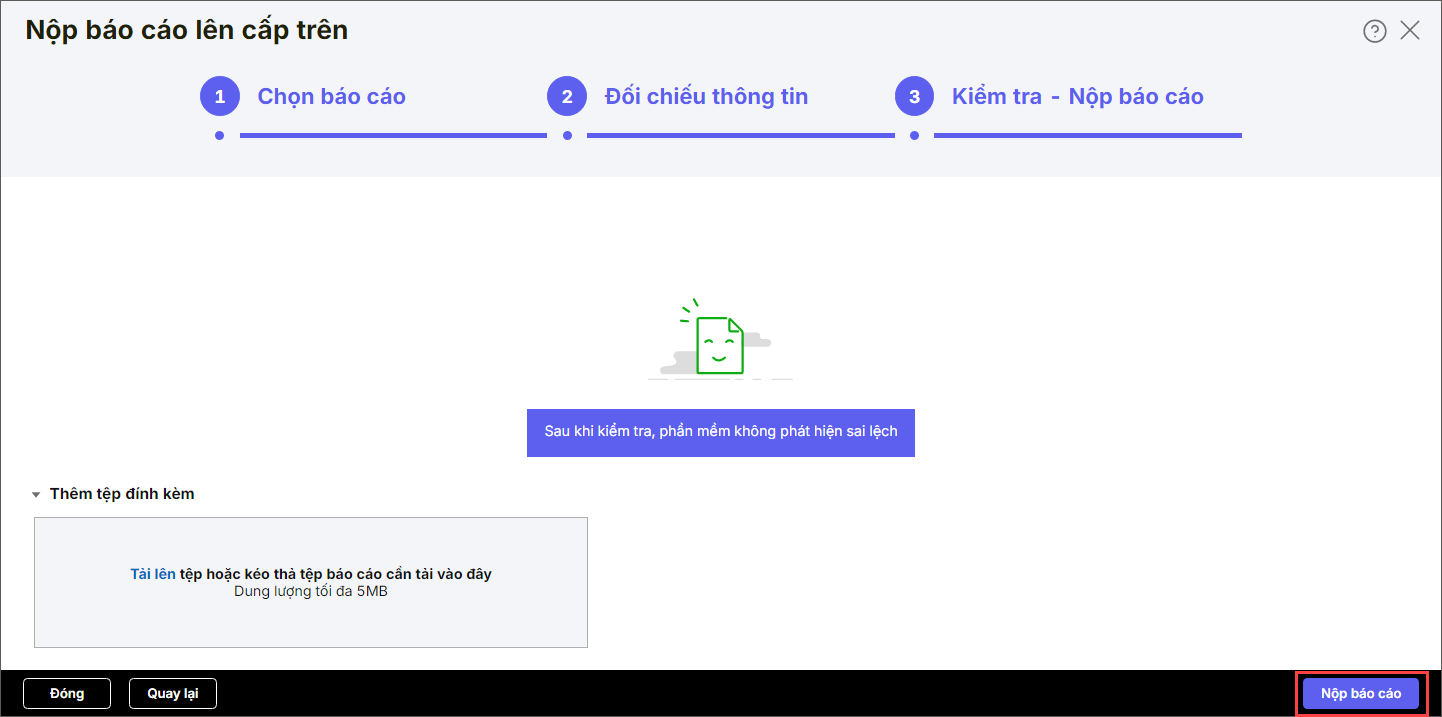- Nếu không phát hiện sai lệch, tải lên các tệp đính kèm (nếu cần) rồi nhấn Nộp báo cáo.