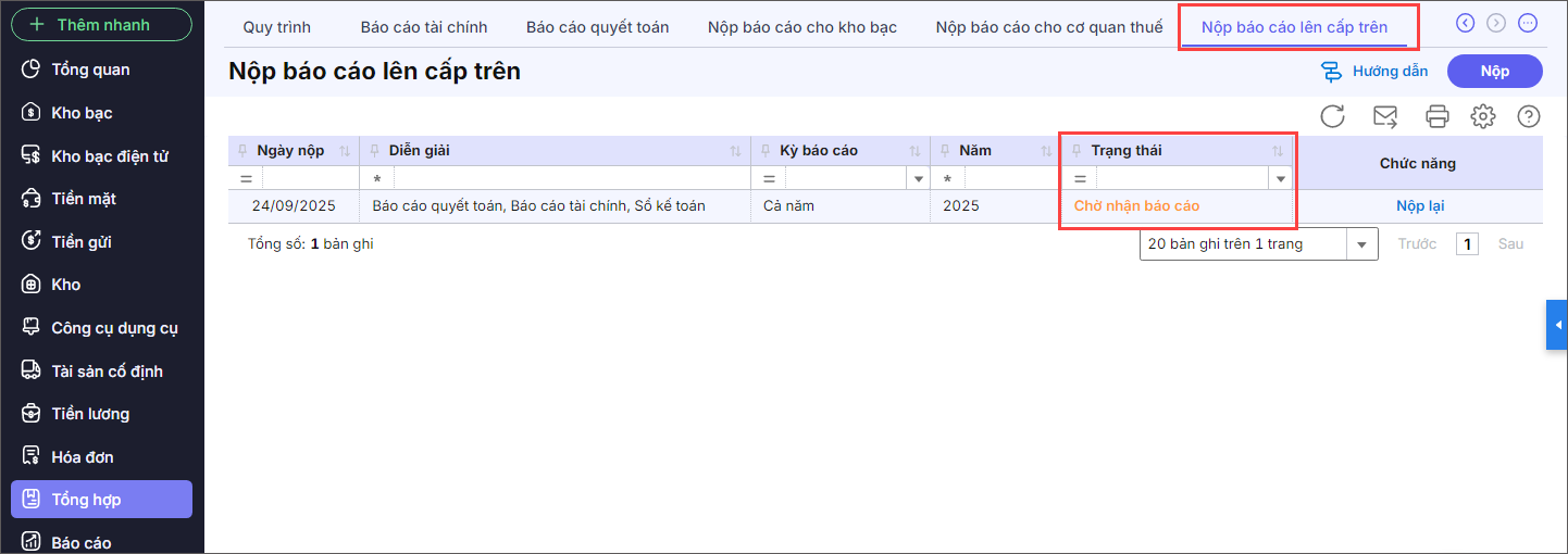 - Trạng thái Đã nộp báo cáo: Báo cáo đã được cấp trên nhận và không thể Nộp lại.
