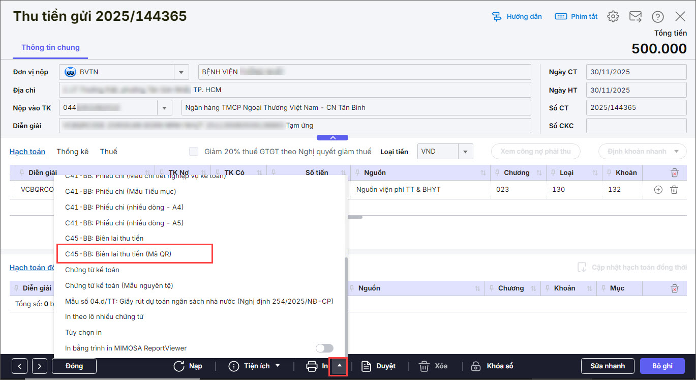 4. In Biên lai thu tiền kèm mã QR thanh toán trên các chứng từ Thu tiền gửi