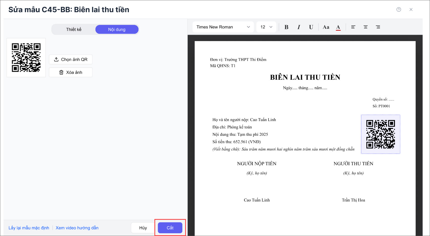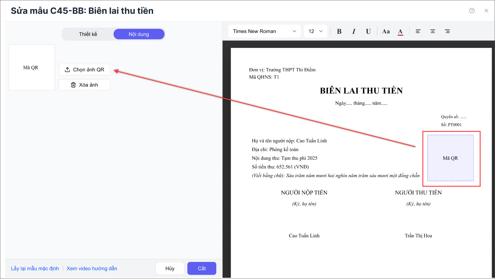 Bước 3: Nhấn chuột vào vị trí mã QR trên biên lai → bấm Chọn ảnh QR và tải ảnh mã QR từ máy tính lên.