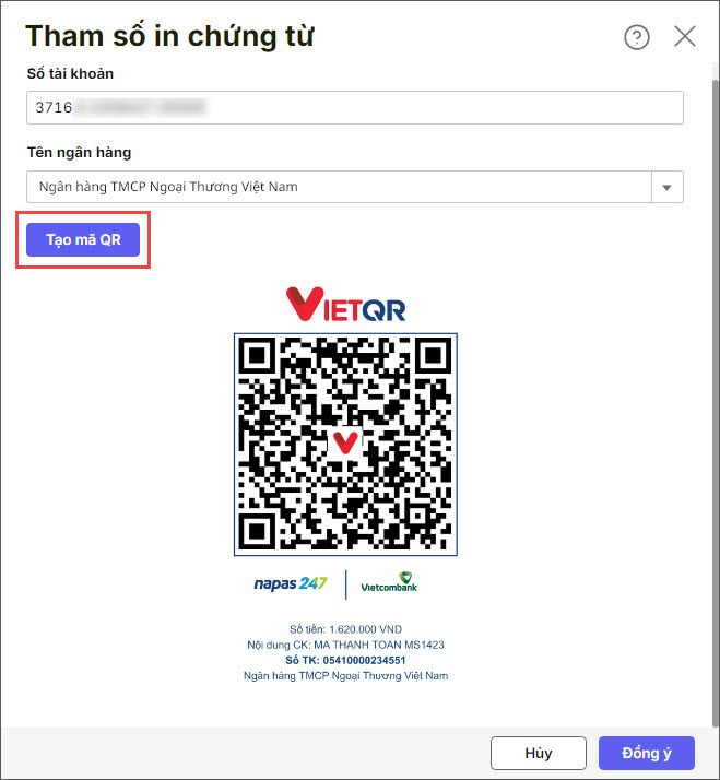• Nhấn Tạo mã QR. Hệ thống sẽ tự động tạo mã QR thanh toán có sẵn các thông tin: Số tiền, Nội dung chuyển khoản,…