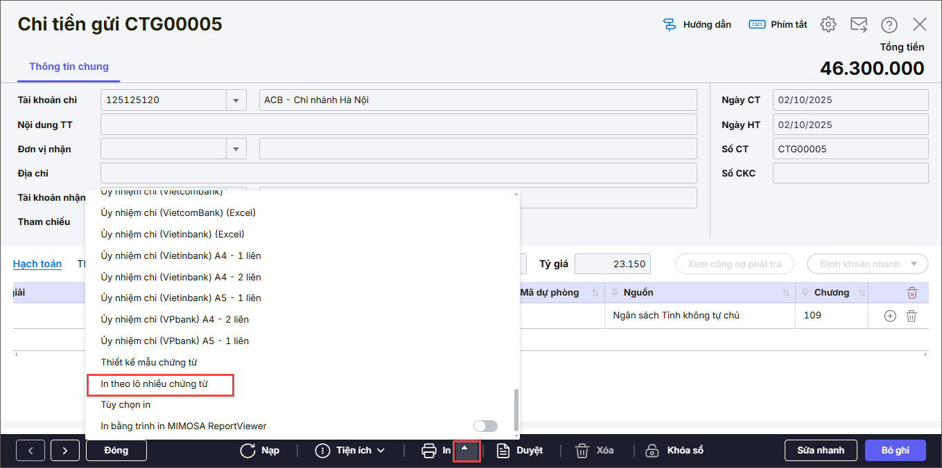 Bước 1: Trên giao diện chứng từ, nhấn In và chọn In theo lô nhiều chứng từ.
