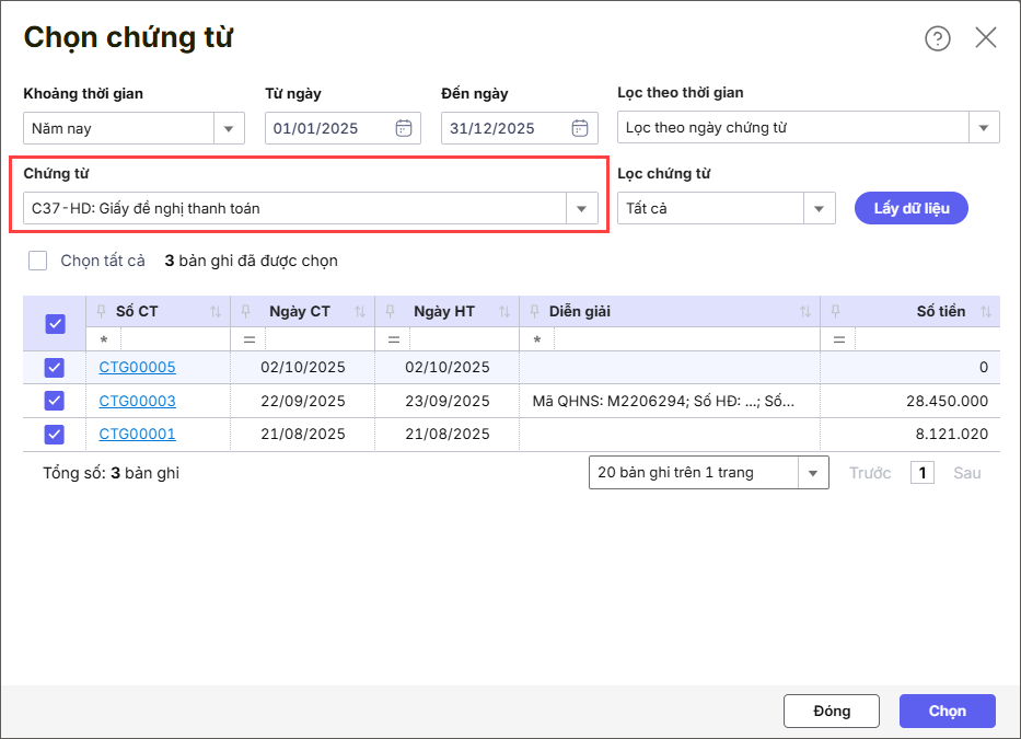 • Chọn loại chứng từ cần in là C37-HD: Giấy đề nghị thanh toán.