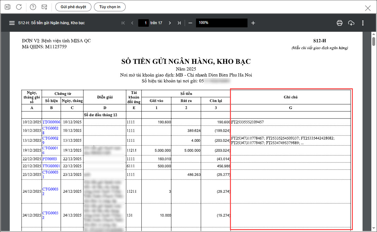 Bài viết này hướng dẫn bạn có thể in S12-H: Sổ tiền gửi ngân hàng, kho bạc hiển thị số giao dịch ngân hàng liên kết với chứng từ kế toán tại cột ghi chú.