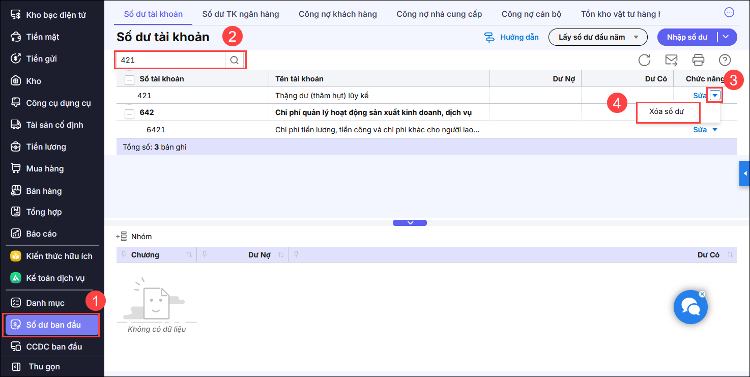 2.1 Nguyên nhân 1: Do số dư đầu năm TK 421, 468 chưa nhập chi tiết theo nguồn, loại khoảnGiải pháp Bước 1: Xóa số dư TK 421, 468 Lưu ý: Trước khi xóa số dư TK 421, 468 nên sao lưu dữ liệu để đảm bảo an toàn Vào menu Số dư ban đầu, Tìm kiếm TK 421, 468, chọn Xoá số dư