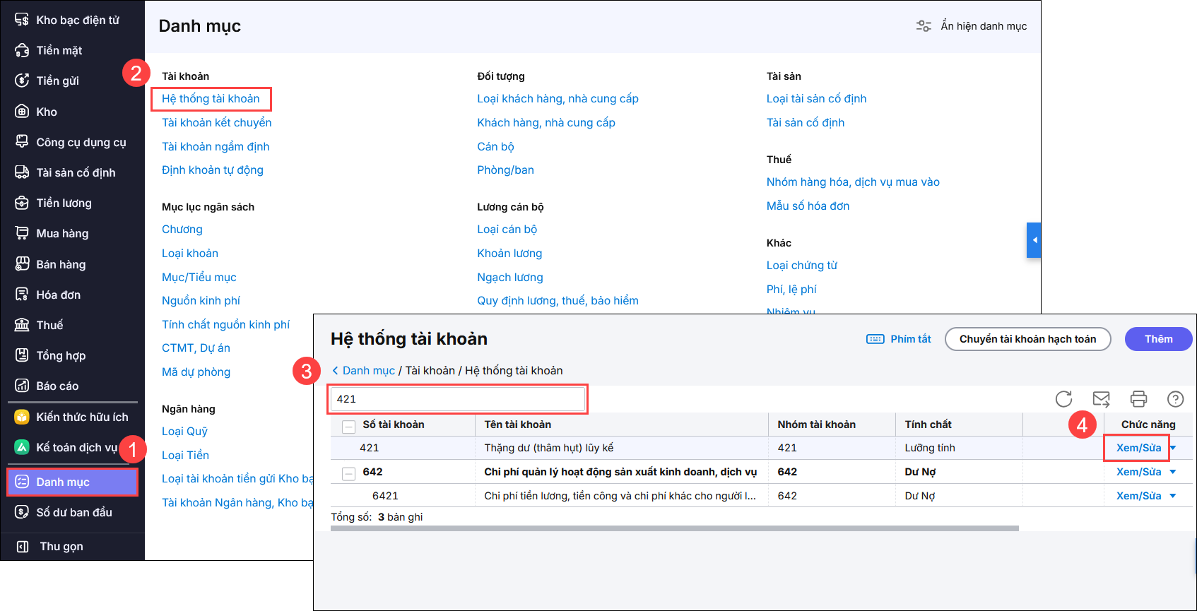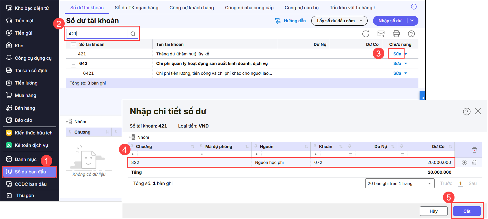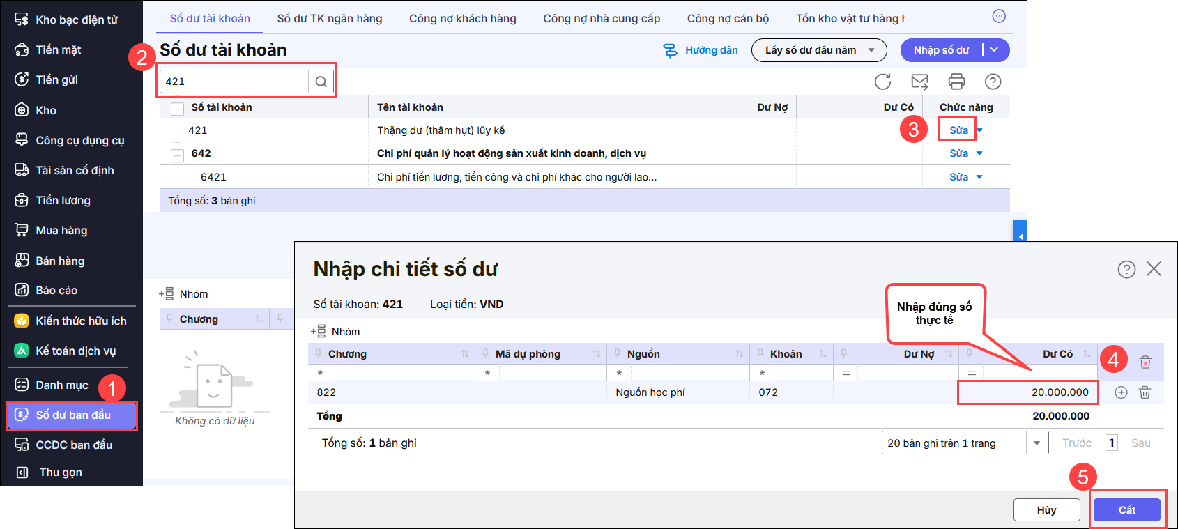 2.2 Nguyên nhân 2: Số dư đầu kỳ của TK 421 đã nhập số dư đầu kỳ chi tiết theo nguồn, loại khoản nhưng bị sai số tiền hoặc sai nguồn so với thực tếGiải pháp: Vào menu Số dư ban đầu tìm đến TK 421, 468 và nhấn sửa. Sau đó, thực hiện nhập lại số dư đúng số tiền và nguồn thực tế.