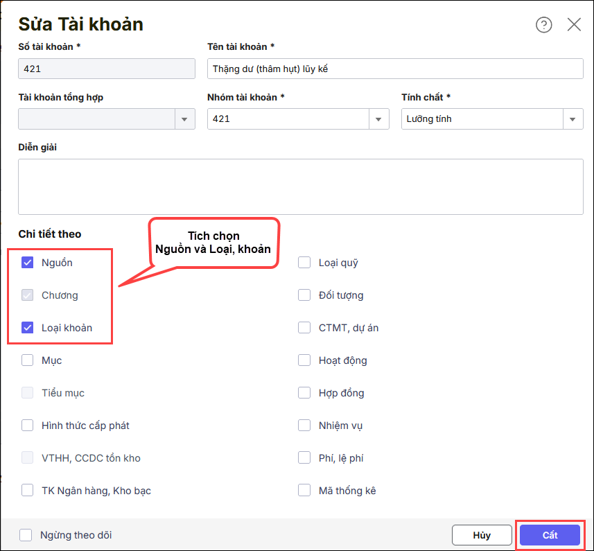 Bước 2: Thiết lập chi tiết TK 421, 468 theo Nguồn, Loại khoản