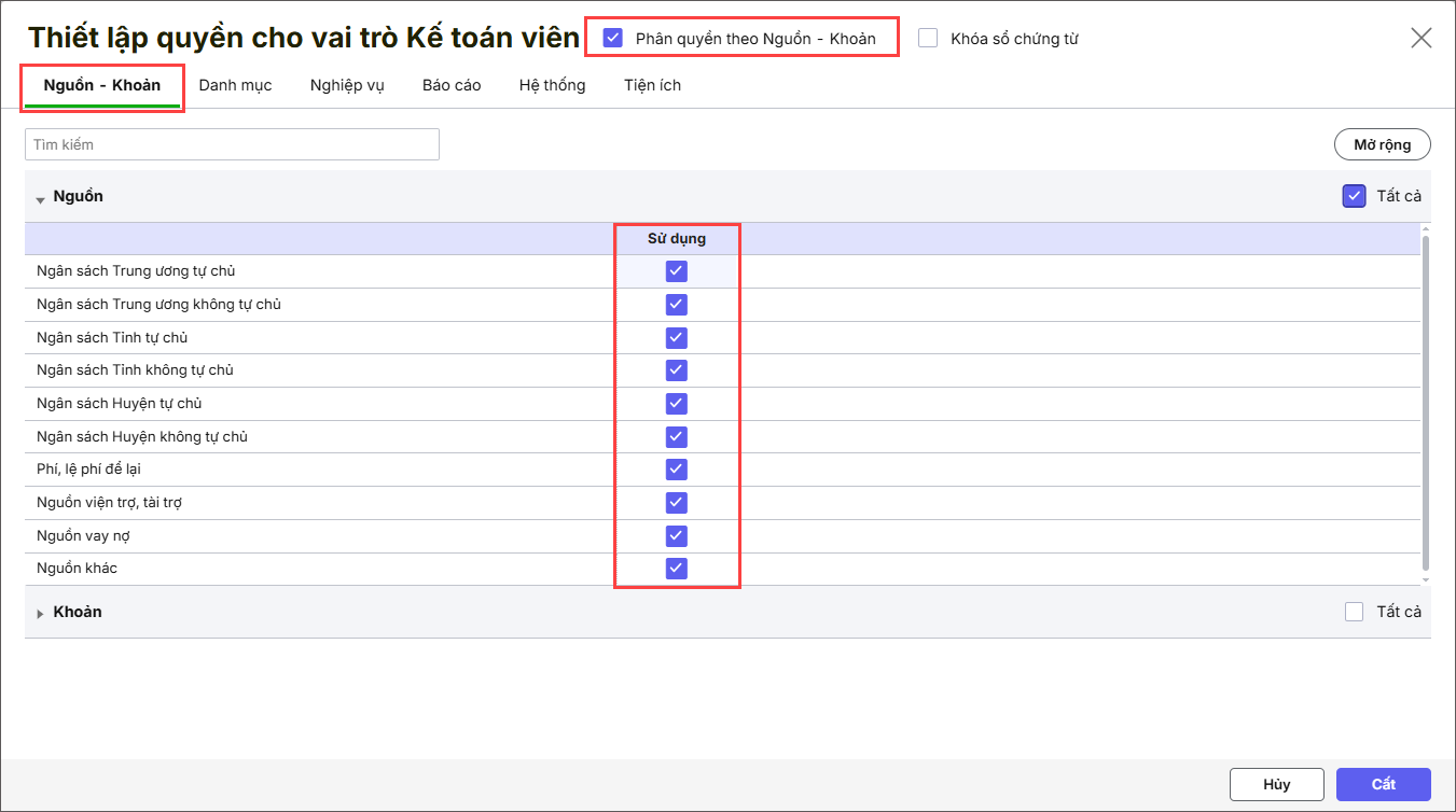 Bước 4: Tích chọn Nguồn, Khoản mà vai trò đó có quyền sử dụng. Hoặc bỏ tích chọn nếu muốn hạn chế quyền.