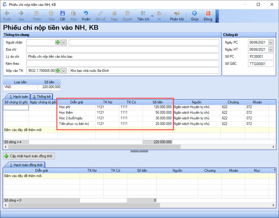 Đơn vị hạch toán chứng từ trên các giao diện sau: Phiếu chi nộp tiền vào NH, KB; Thu tiền gửi; Chuyển khoản kho bạc vào tài khoản tiền gửi.