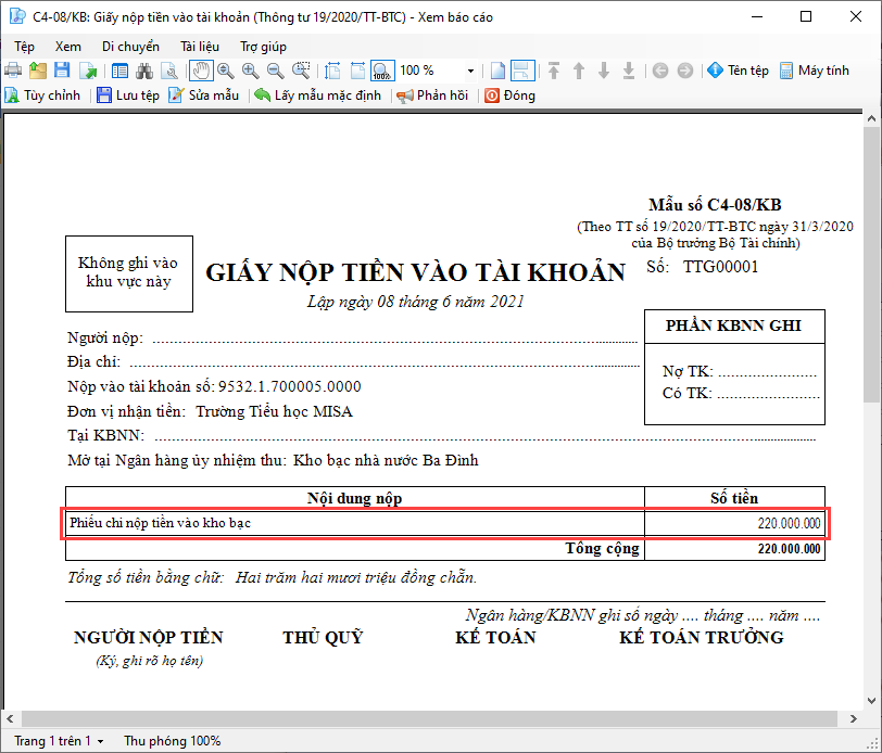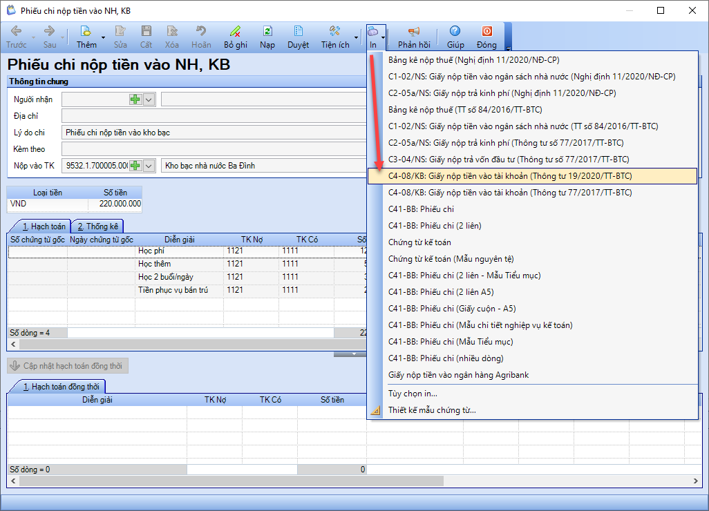 - Nhấn In\C4-08/KB: Giấy nộp tiền vào tài khoản (Thông tư 19/2022/TT-BTC).