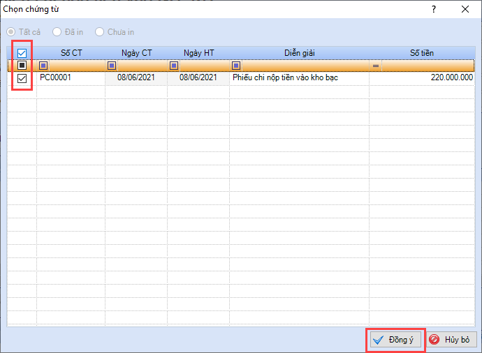 - Tích chọn chứng từ cần in.